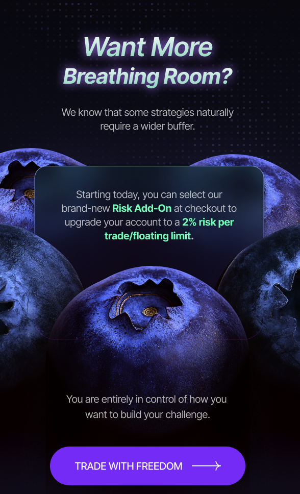 Alongside the rule changes, Blueberry Funded has introduced a 2% Risk Add-On, giving traders the option to operate with a slightly higher risk limit at checkout. According to the firm, this addition is for strategies that require more flexibility while maintaining accountability.